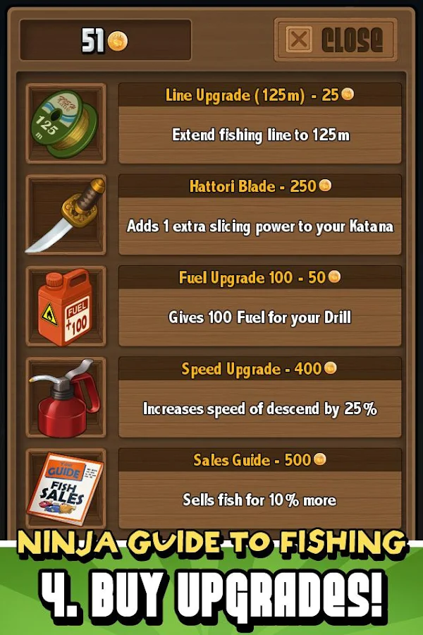 ✔ ganhar o ouro para comprar lotes de super atualizações como katanas, barcos, guias de pesca e muito mais.